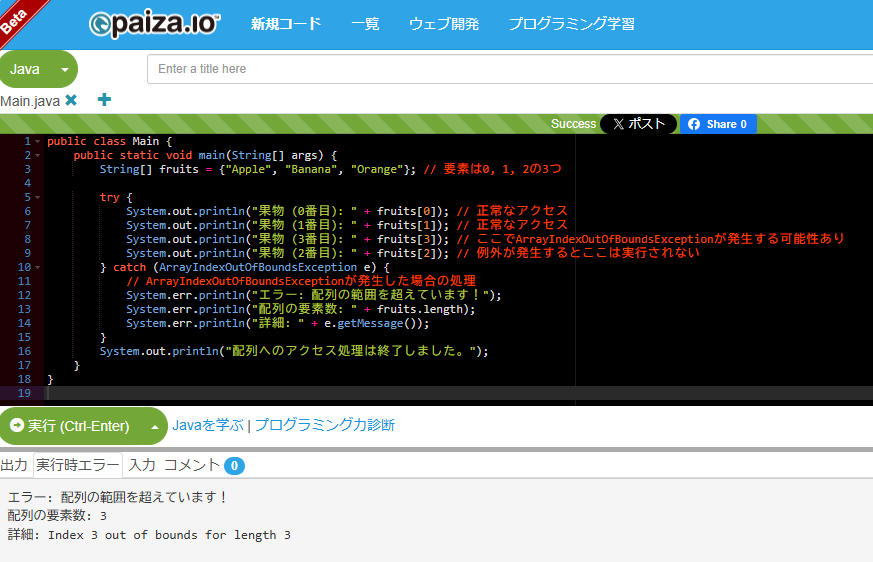 System.out.println("果物 (2番目): " + fruits[2]); // 例外が発生するとここは実行されない