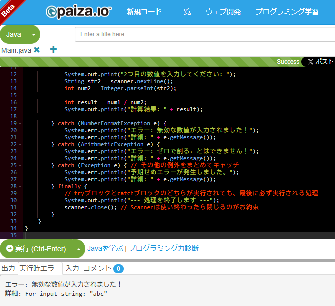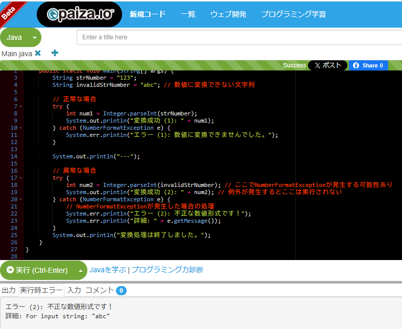 System.out.println("変換成功 (2): " + num2); // 例外が発生するとここは実行されない