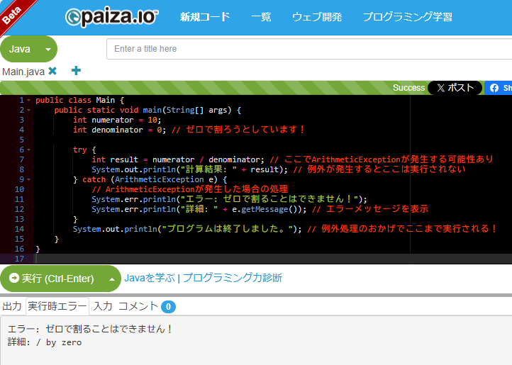 例外処理がない場合、プログラムはnumerator / denominator;の行で強制終了してしまいますが、try-catchを使うことで、エラーメッセージを表示しつつも、最後のSystem.out.println("プログラムは終了しました。");まで実行されるのが分かりますね。