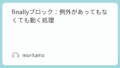 上の例で出てきたfinallyブロックは、tryブロックとcatchブロックのどちらが実行されたとしても、必ず最後に実行される処理を書く場所です。ファイルのクローズ処理やデータベース接続の切断など、確実に実行したい後処理に利用されます。