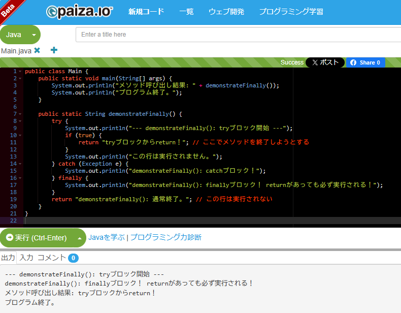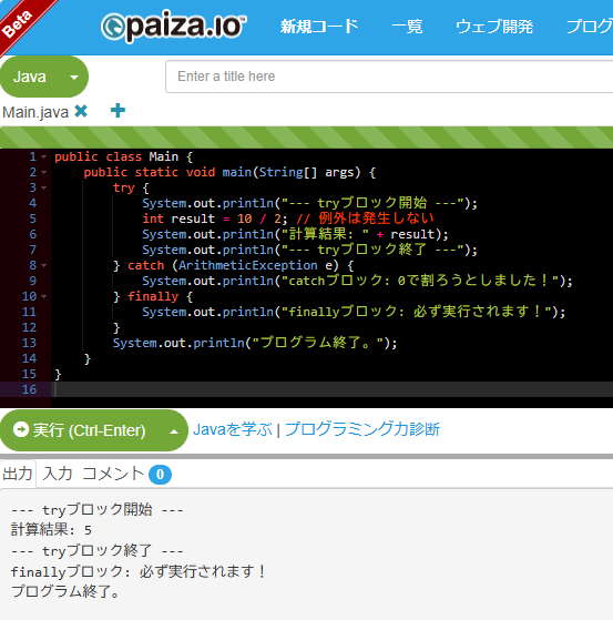 いくつか例を見て、finallyブロックがどう動くのかをしっかり理解しましょう。