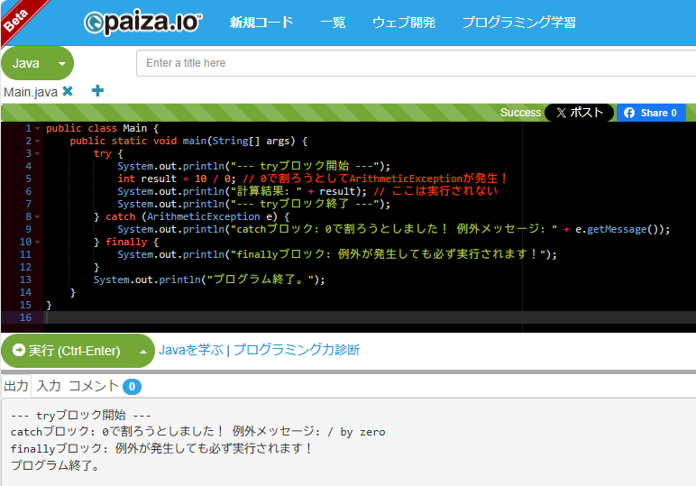 catchブロック: 0で割ろうとしました! 例外メッセージ: / by zero