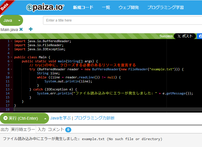 このtry-with-resources文を使うと、tryの丸かっこ()の中で宣言したリソース(この場合はBufferedReader)が、tryブロックの処理が終わった時に自動的に閉じられます。つまり、finallyブロックで明示的にクローズ処理を書かなくてもよくなるんです!これはすごく便利ですよね。