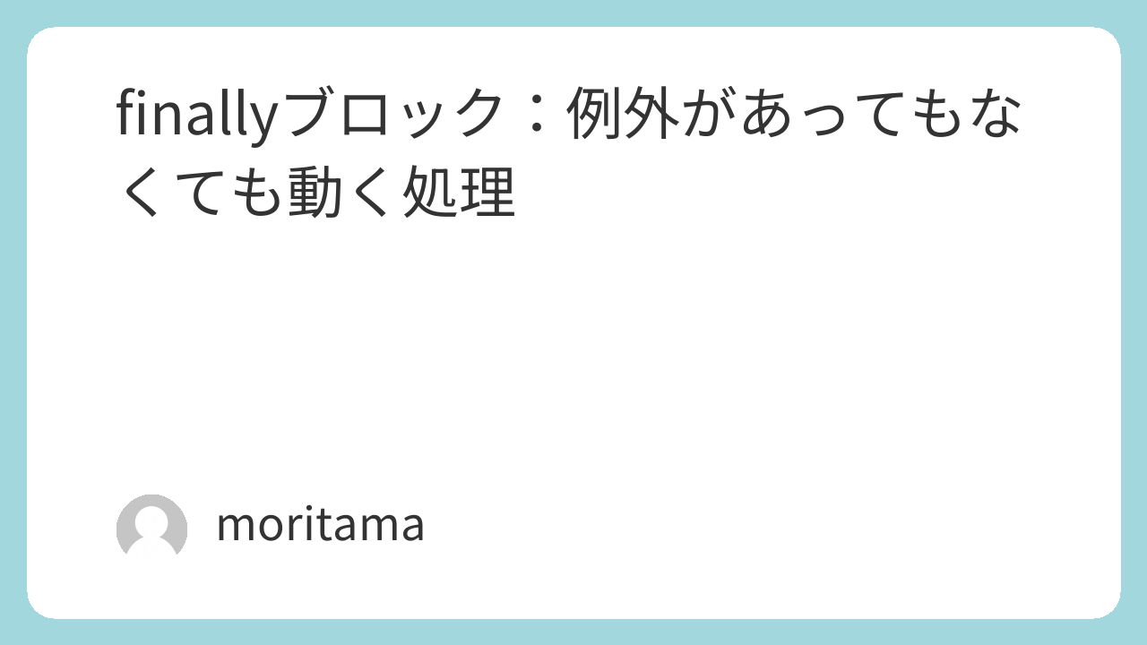 finallyブロックは、tryブロックやcatchブロックの例外の有無にかかわらず、必ず実行される処理を書く場所です。- 主に、ファイルやデータベース接続などの**リソースの解放(後片付け)**に利用されます。