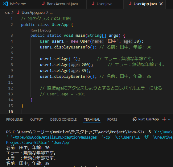 ユーザーの名前や年齢を管理するUserクラスを考えてみましょう。年齢はマイナスになったり、異常に大きな値になったりしないように制御したいです。