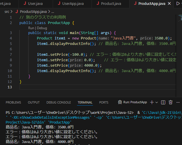 このProductクラスでも、priceフィールドはprivateで保護され、setPrice()メソッドを通じてのみ変更できます。setPrice()内で価格が正の値であるかをチェックすることで、誤った価格設定を防いでいます。