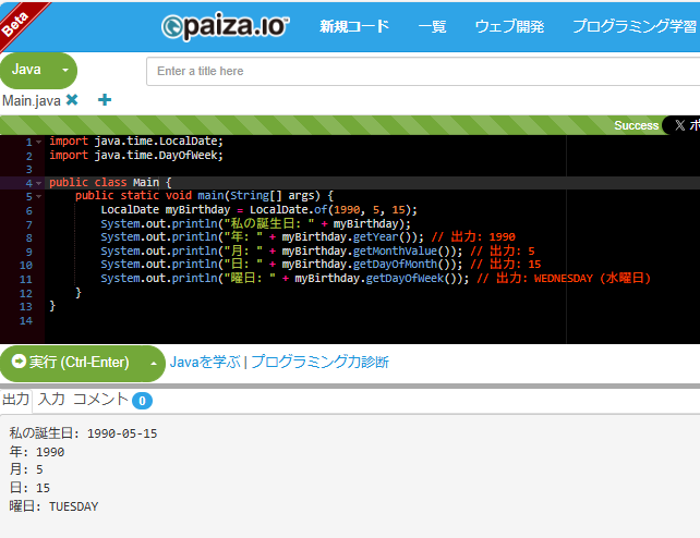 System.out.println("曜日: " + myBirthday.getDayOfWeek()); // 出力: WEDNESDAY (水曜日)