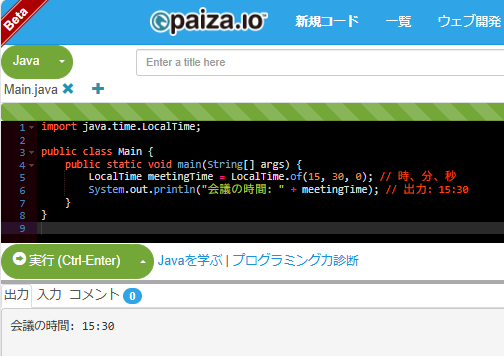 System.out.println("会議の時間: " + meetingTime); // 出力: 15:30