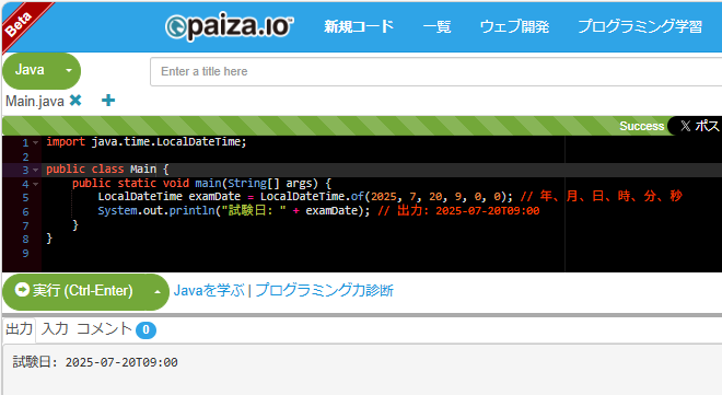 LocalDateTime examDate = LocalDateTime.of(2025, 7, 20, 9, 0, 0); // 年、月、日、時、分、秒