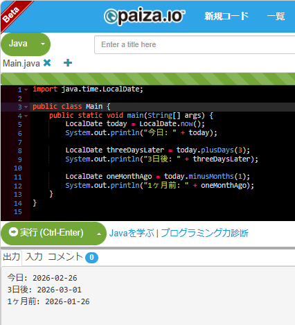 「3日後」とか「1ヶ月前」みたいな計算は plus()minus() メソッドを使うんだ。